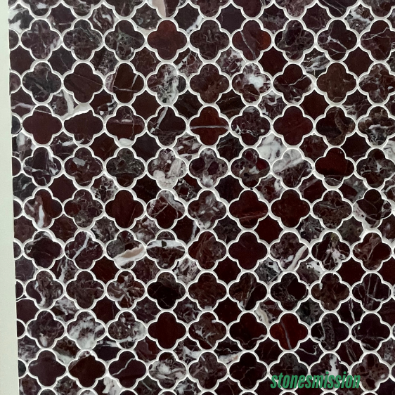 Dark brown quatrefoil marble mosaic tiles with an elegant and classic pattern. The rich brown color and the quatrefoil shape bring a touch of sophistication to any space.