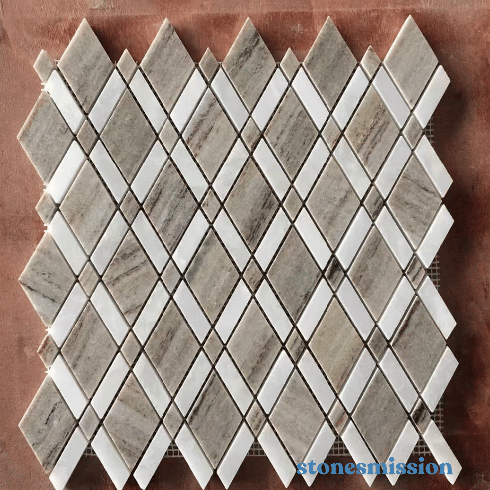 These diamond - shaped gray and white marble mosaic tiles feature a modern and stylish design. The combination of gray and white marbles creates a subtle contrast, adding visual interest. The diamond pattern gives a sense of elegance and uniqueness. Made from high - quality marble, they are sturdy and easy to maintain. Suitable for accent walls, floors in living rooms, or as part of a bathroom design, they can bring a contemporary and refined touch to your interior.