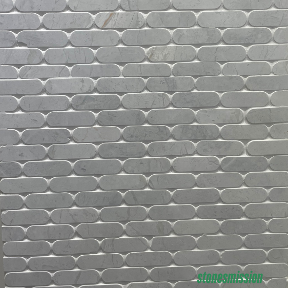 Grey oval marble mosaic tiles for a modern and sleek look. The grey color and oval shape create a contemporary aesthetic, great for minimalist interiors.